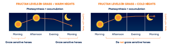 Gräser speichern Zucker in Form von Fructanen. An warmen, sonnigen Tagen steigen die Fructanwerte im Gras an. Normalerweise nutzt die Pflanze diese Zucker über Nacht für ihr Wachstum — aber wenn die Nächte kalt sind, sinken die Temperaturen zu stark für das Pflanzenwachstum. Die Zucker können nicht abgebaut werden und häufen sich an.