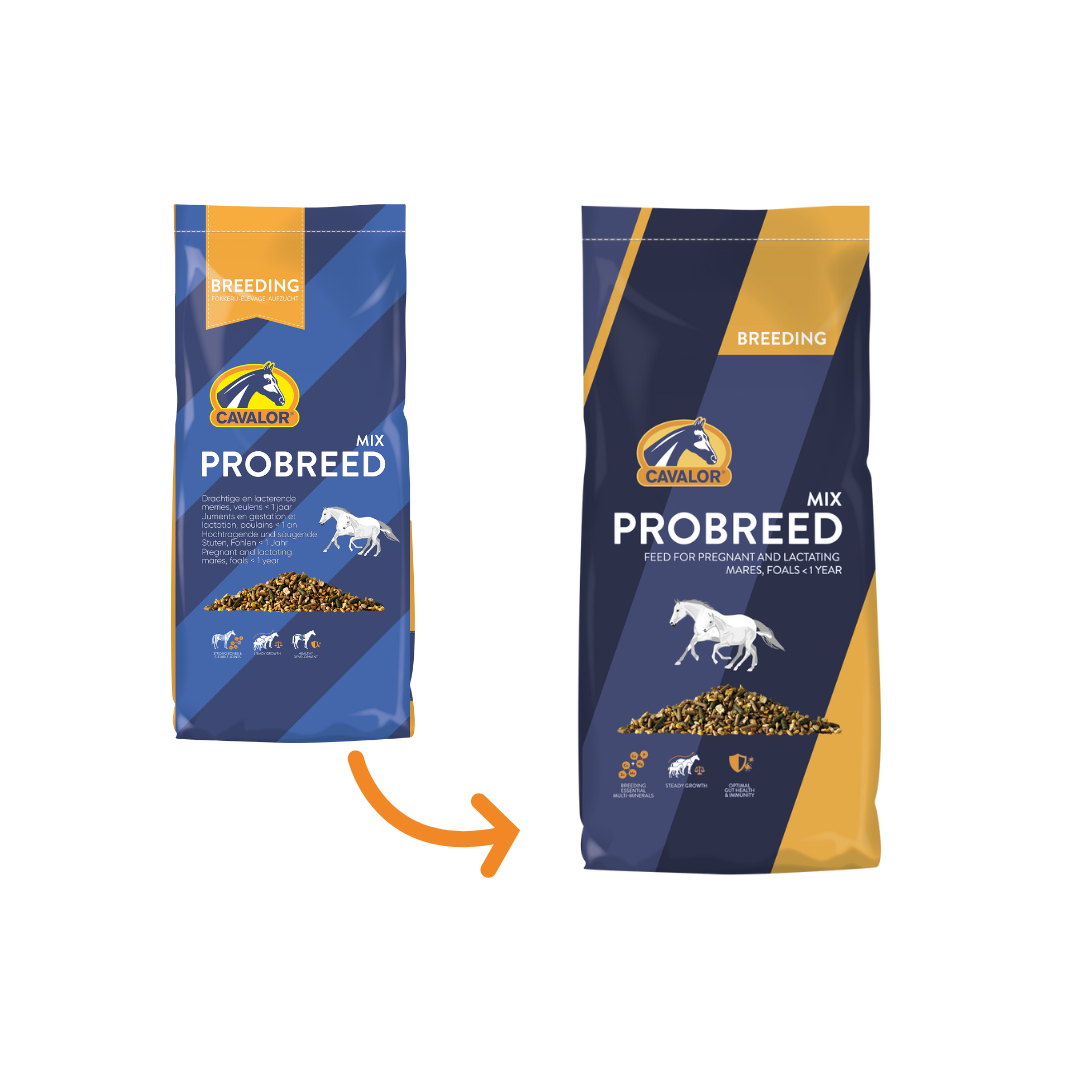 Make sure that your horse always has access to sufficient and good quality roughage and drinking water. You will also continue to give the mare Cavalor Probreed (mix or pellet) during lactation. The need for extra energy, protein and minerals increases most during lactation. And you will have to increase the amount of concentrated feed. Is your mare in the pasture with her foal day and night with plenty of spring grass? Then she doesn’t need much extra concentrated feed. Once the foal is three months old, it can eat concentrated feed along with its mother. So don’t forget to replenish as needed.