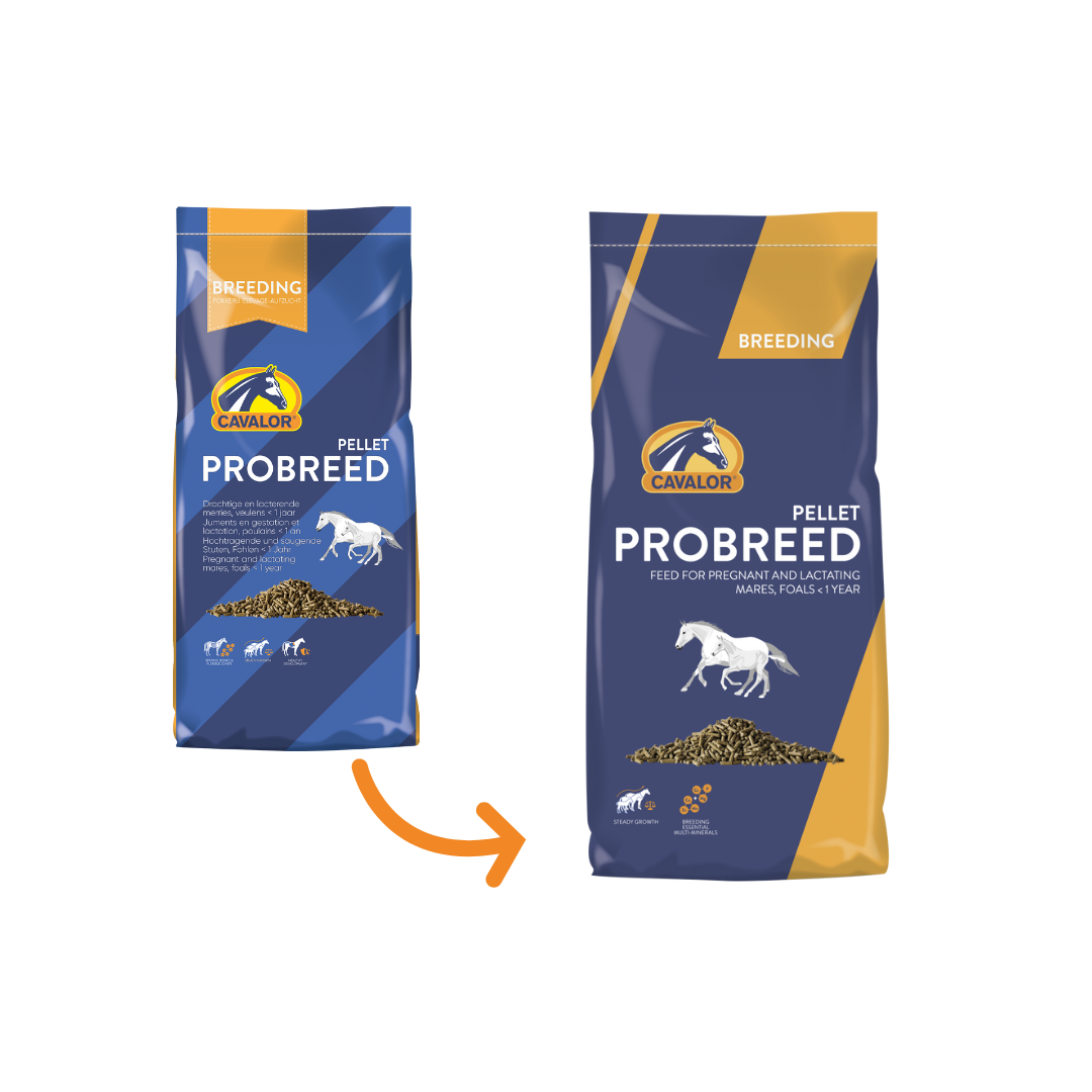 Feeding a broodmare and her foal actually already started four months before the birth. From the seventh month of pregnancy, mares need additional nutrients to support the foal’s development and to prepare for producing milk at the end of pregnancy. Moreover, the mare can no longer sufficiently pass on certain trace elements, such as copper, after the eighth month of pregnancy. We thus recommend that you gradually switch to a concentrated feed high in energy and highly digestible protein, such as Cavalor Probreed mix or pellet, four months before birth.