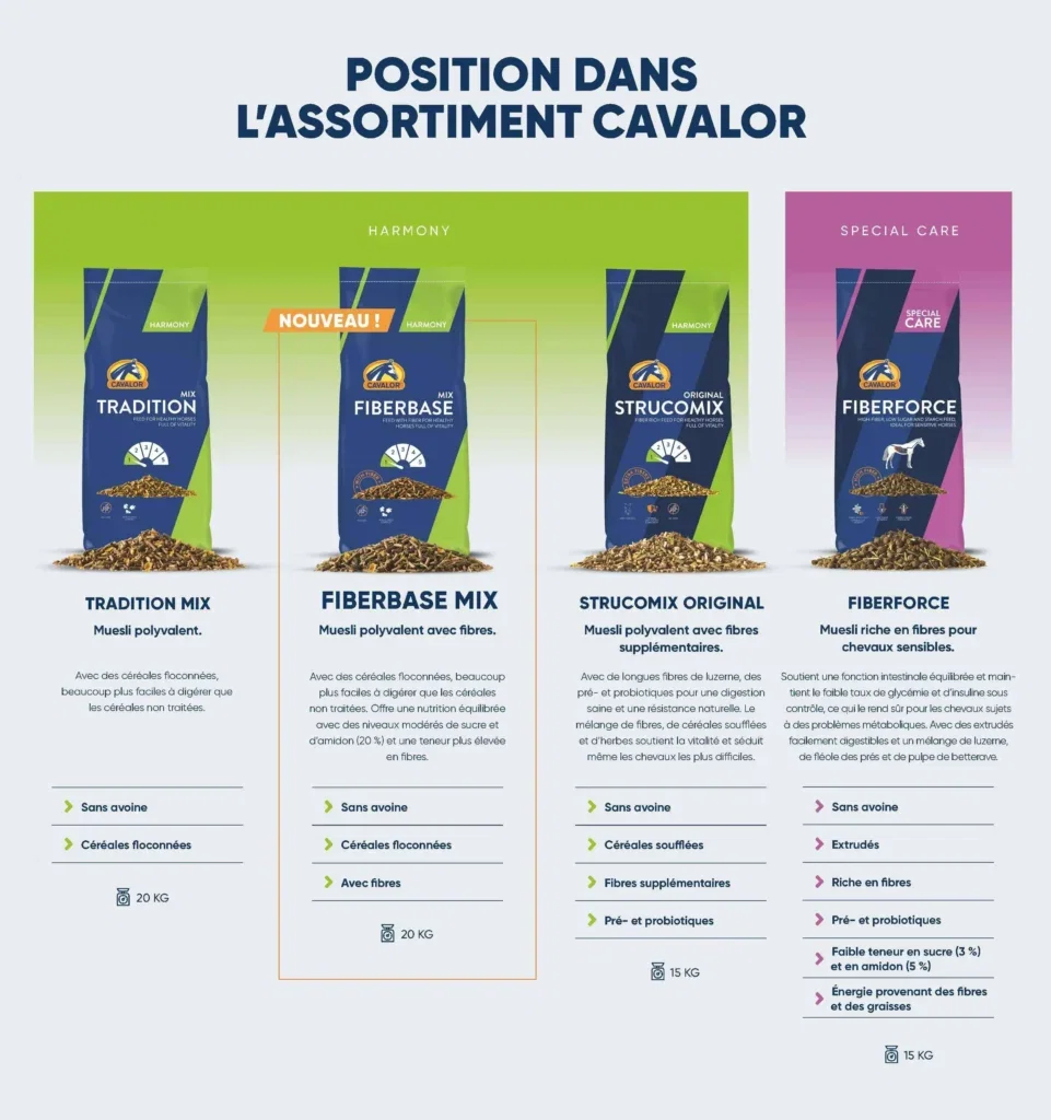 Lorsque vous choisissez un muesli polyvalent, vous recherchez généralement trois choses : un aliment que votre cheval digère bien, un profil nutritionnel adapté au travail fourni et un choix fiable au quotidien. Dans la gamme Cavalor Harmony, FiberBase Mix a été conçu précisément dans cet objectif : un muesli polyvalent avec fibres, adapté comme aliment quotidien fiable.