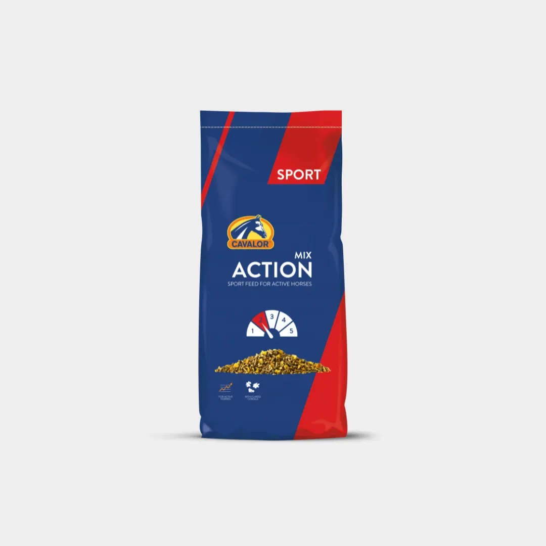Cavalor Action Mix is a sports muesli for active horses. With flaked cereals, much easier to digest than unprocessed cereals. Cavalor Action Mix is a level 2 feed for horses receiving regular and active training.