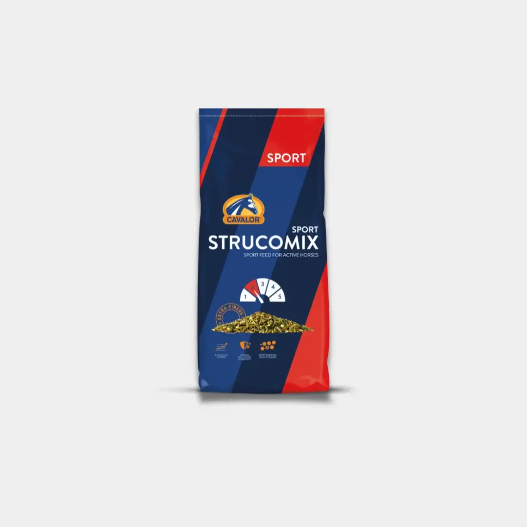 Cavalor Strucomix Sport is a fibre-rich muesli for active horses. It contains long fibres which stimulate chewing and intestinal motility. Contains pre- and probiotics for the development of a healthy intestinal flora, providing the basis for natural resistance. With puffed cereals for good absorption and easy digestion. With essential multivitamins that supply the higher levels needed for horses that have to deliver serious performance. B-complex vitamins play a key role in energy management.