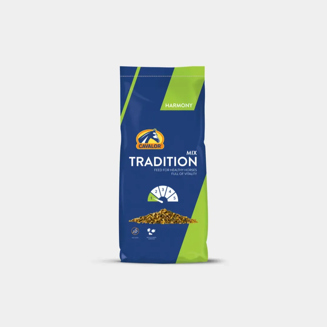 Cavalor Tradition Mix is a muesli for healthy horses full of vitality. With flaked cereals, much easier to digest than unprocessed cereals. Oat-free formula. Cavalor Tradition Mix is a level 1 feed for horses receiving recreational to light training or sensitive horses.