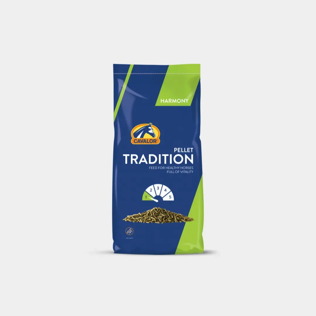 Cavalor Tradition Pellet is a pellet for healthy horses full of vitality. Oat-free formula. Cavalor Tradition Pellet is a level 1 feed for horses receiving recreational to light training or sensitive horses.