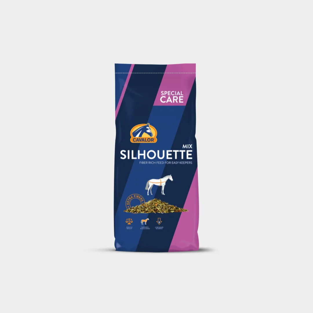 Cavalor Silhouette is a high-fibre muesli for plain breeds, easy keepers and horses that are prone to rapid weight gain. It supplies all the essential nutrients, including protein, vitamins and minerals. Low in sugar (5%) and starch (6%), it gives the horse energy from fibre. It also contains easily digestible proteins with an amino acid profile that is very similar to the horse's own muscles. This helps the horse retain muscle while reaching a healthy weight.