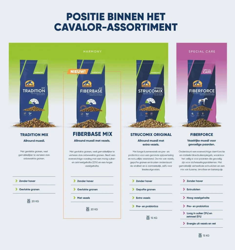 Wanneer je een allround muesli kiest, wil je meestal drie dingen: een voer dat je paard goed verteert, een voedingsprofiel dat past bij het werk dat je doet en een keuze waar je dag na dag op kunt vertrouwen. Binnen het Cavalor Harmony-gamma is FiberBase Mix precies daarvoor ontwikkeld: een allround muesli met vezels die geschikt is als betrouwbaar dagelijks voer.