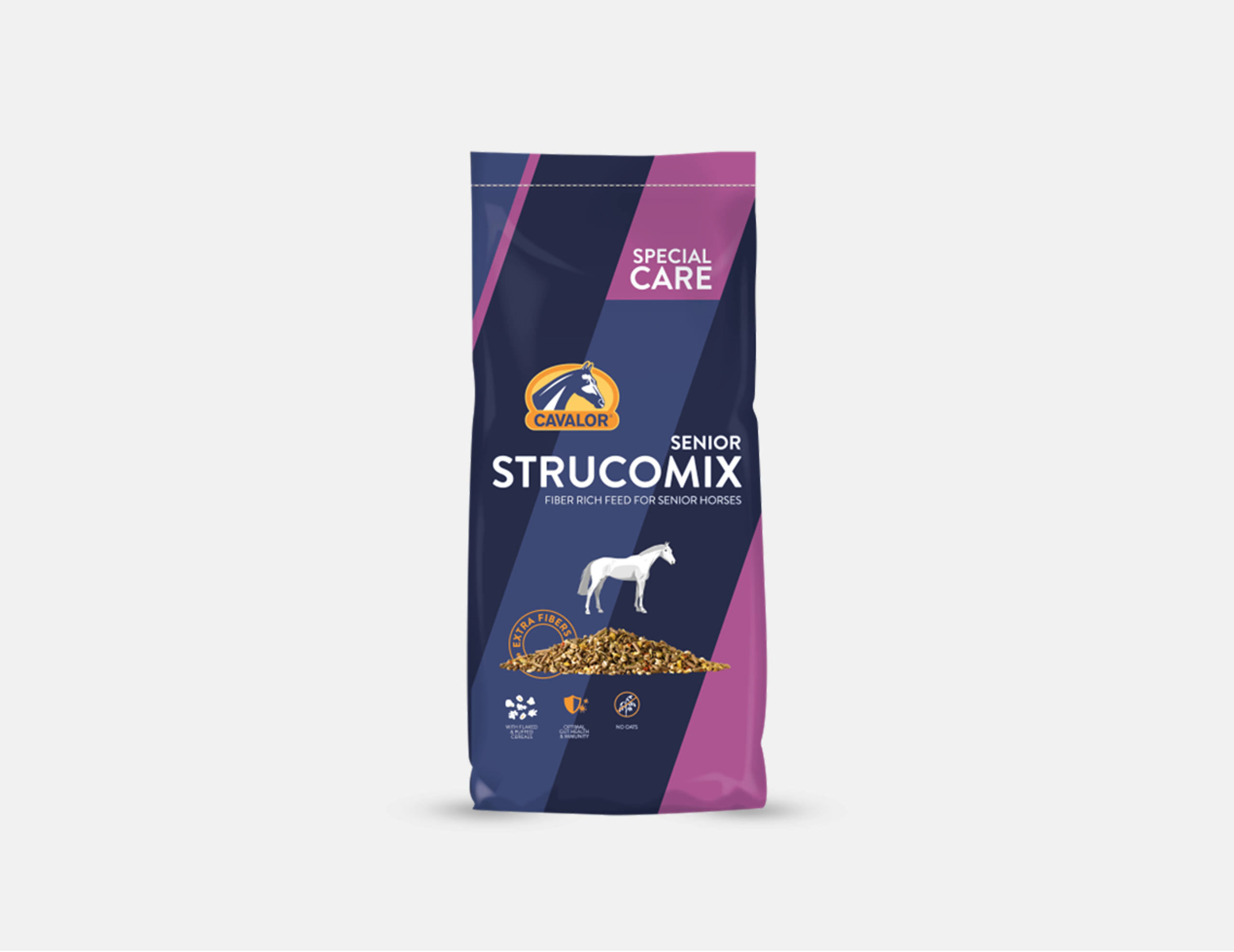 Cavalor Strucomix Senior is een vezelrijke muesli voor oudere paarden. Met lange luzerne vezels die het kauwen en darm bewegelijkheid stimuleren. Bevat pre- en probiotica voor de ontwikkeling van een goede darmflora, de basis voor een natuurlijke weerstand. Geformuleerd zonder haver. Met gepofte granen voor een goede opneembaarheid en vlotte vertering. Het hogere eiwitgehalte zorgt dat oudere paarden makkelijk op gewicht blijven en spieren behouden blijven.